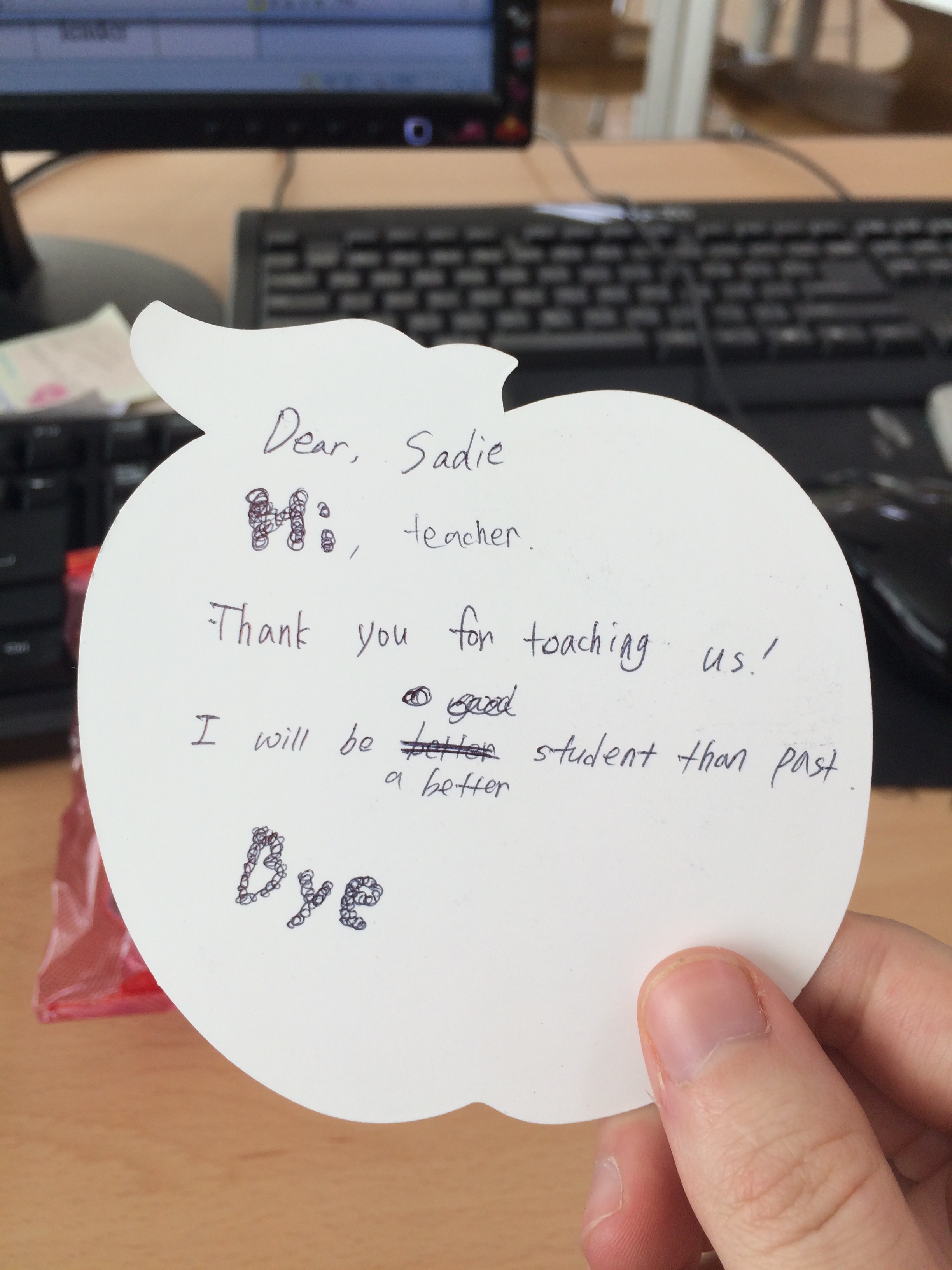 It is also a chance for students to suck up to their teachers, which I am perfectly fine with. They wrote me a cute note to go along with my apple.